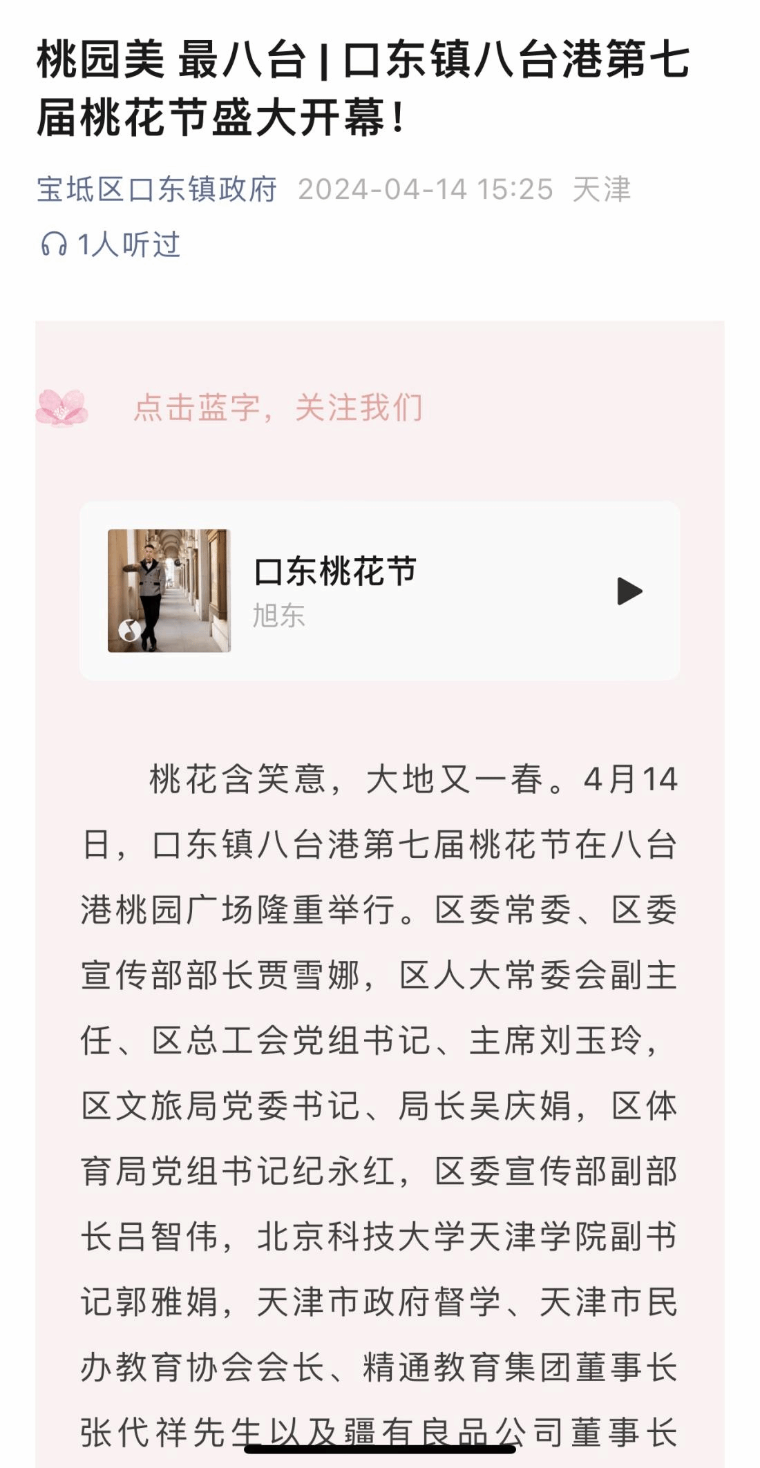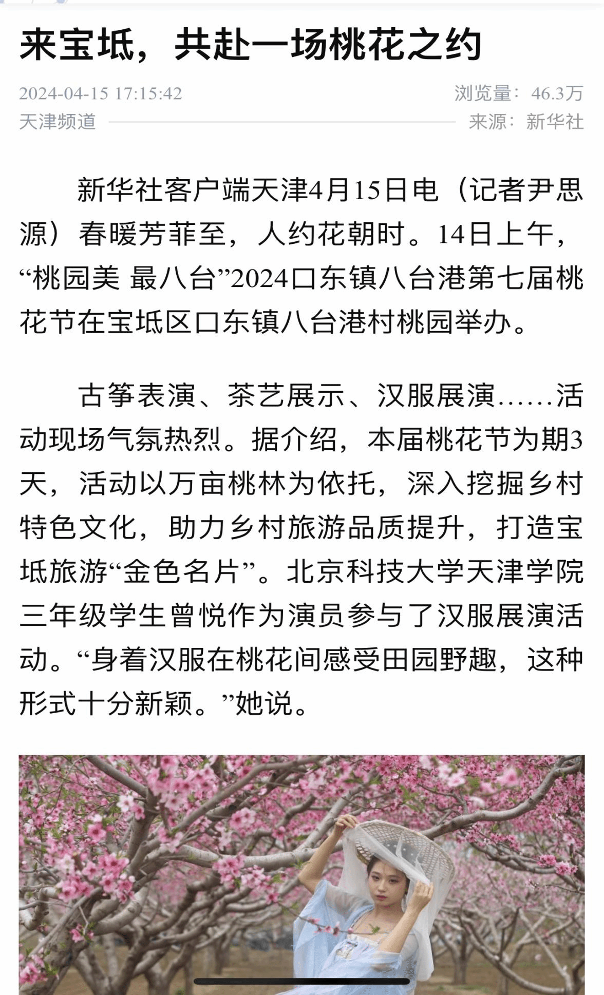 共赴桃花之約,盡享春日盛景。本次活動(dòng),北京科技大學(xué)天津?qū)W院團(tuán)委開啟了一場(chǎng)青年學(xué)生與鄉(xiāng)村振興的“雙向奔赴”,不僅得到了主辦方的高度評(píng)價(jià)和認(rèn)可,也受到了人民網(wǎng)、新華社、網(wǎng)易新聞、寶坻融媒等多家媒體的宣傳報(bào)道。