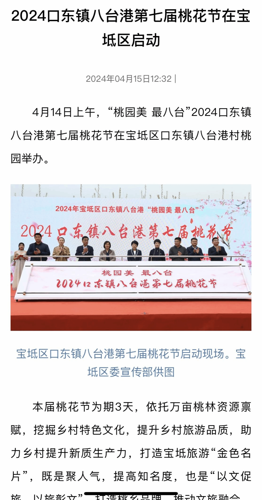 為全面貫徹黨的二十大和二十屆二中全會(huì)精神,深入學(xué)習(xí)貫徹習(xí)近平總書記視察天津重要講話精神,貫徹落實(shí)鄉(xiāng)村振興戰(zhàn)略,北京科技大學(xué)天津?qū)W院團(tuán)委組織60余名學(xué)生赴口東鎮(zhèn)八臺(tái)港村參加“桃園美 最八臺(tái)”2024口東鎮(zhèn)八臺(tái)港第七屆桃花節(jié)活動(dòng),豐富鄉(xiāng)村文化內(nèi)涵,提高鄉(xiāng)村旅游品質(zhì),助力鄉(xiāng)村經(jīng)濟(jì)發(fā)展,為鄉(xiāng)村振興貢獻(xiàn)青春力量。