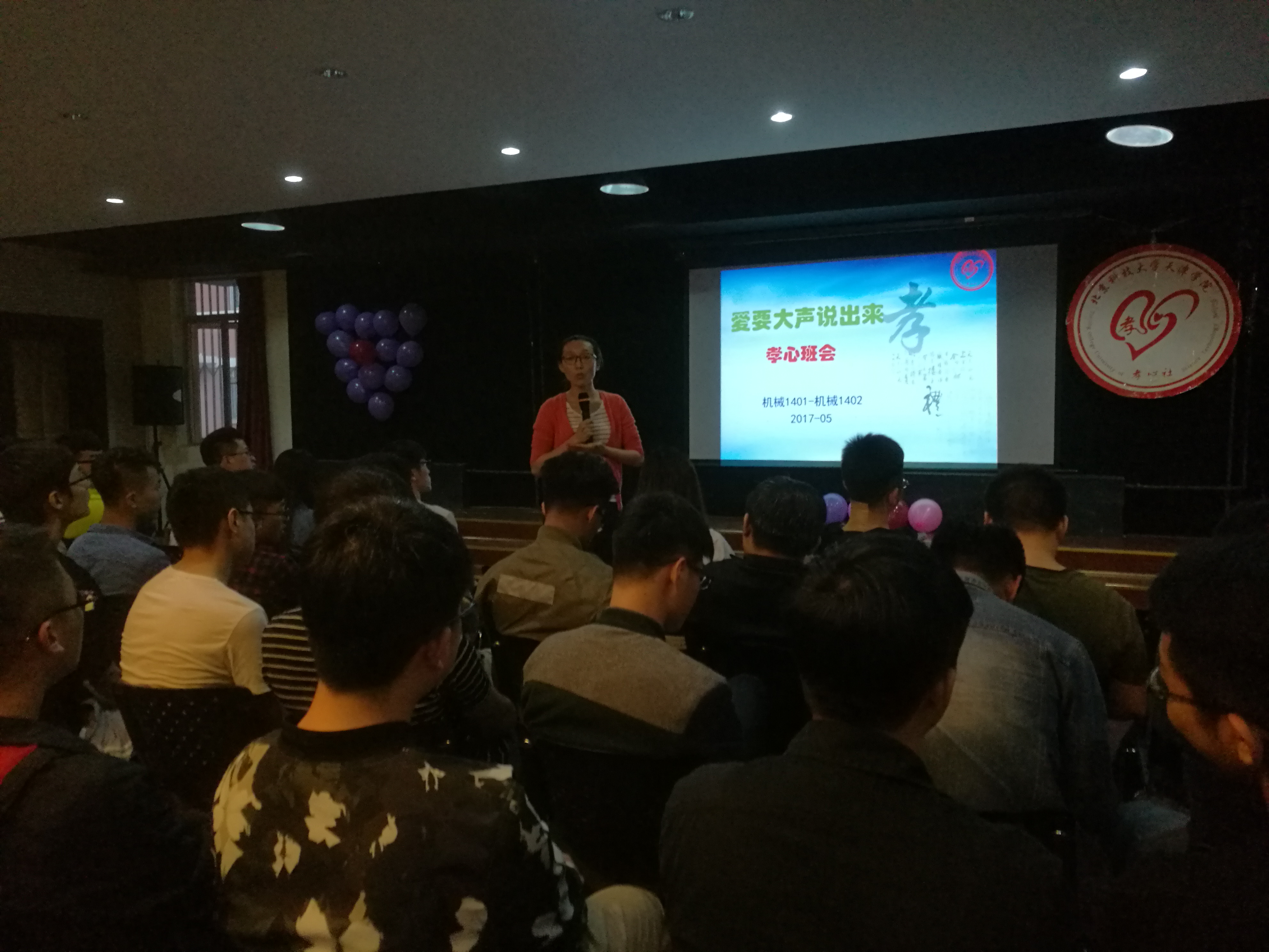 5月2日18點,孝心社主辦的“愛要大聲說出來”孝道主題教育系列活動在學生活動中心舉行,本次活動走進機械系機械1401和1402班。機械系黨總支書記郭雅娟,14級學生輔導員尤文婷參加了此次活動。