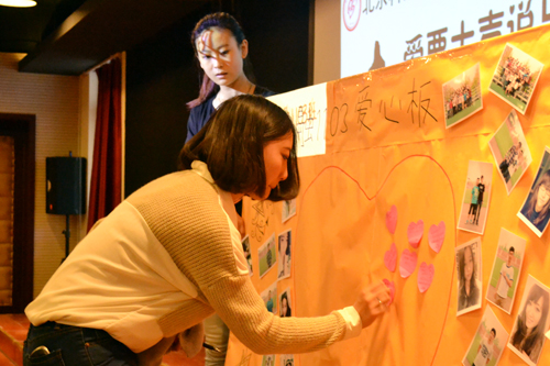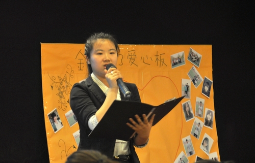 一段簡單的開場之后,孝心社張永康同學首先與大家分享了他對孝的理解。 “孝心,并非是長大后才有的責任,也并非是用金錢就能彌補”、“孝心其實很簡單,比如,為家里清掃一次房間;為母親倒一杯水;為父親捶一次背……”樸實的話語道出了他對孝的點滴體會。金融1103班班同學自己拍攝并制作的視頻記錄了他們對父母想說的話。孝心社劉曉通過自己的親身經歷告訴了大家“行孝不能等”這個道理,很多同學聽完之后都默默的擦起了眼淚。李翔同學演唱的《父親》也深深的打動了大家。部分同學的父母用電話錄音的方式表達了他們對于在遠方求學的同學們的掛念和祝福。全班同學和著鋼琴伴奏共同演唱了《燭光里的媽媽》,歌聲傳遞了同學們對爸爸媽媽的祝福?;顒幼詈?,同學們將自己對爸爸媽媽想要說的話寫在留言板上,一句句簡單的話表達了對父母真摯的愛。