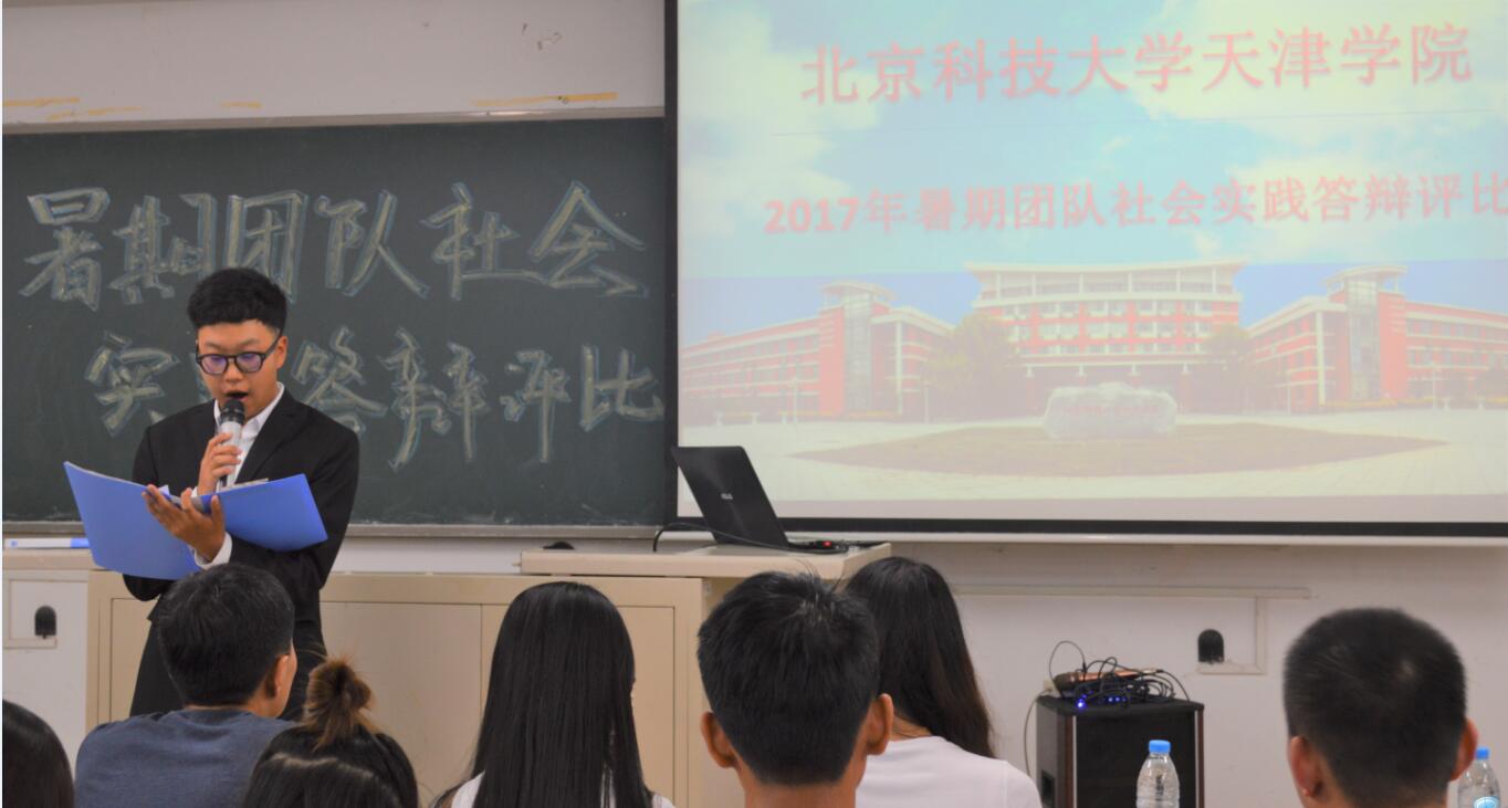 2017年9月26日18:30,在8教103舉行北京科技大學天津學院暑假團隊實踐答辯評比活動。出席此次大會的有團委書記殷實、團委副書記王研、團委宣傳部部長、外語系團委書記張添善、團委組織部部長陳筱、團委文藝部部長劉洋、團委科技部、青協主任林小茹、材料系分團委書記何歡歡、機械系分團委書記朱嘉陽、信息系分團委書記任兆歡、經濟系分團委書記洪燁、管理系分團委書記查嬡嫄、法律系分團委書記孫超、藝術系分團委書記李洋、團委實踐部部長、素拓主任趙怡。