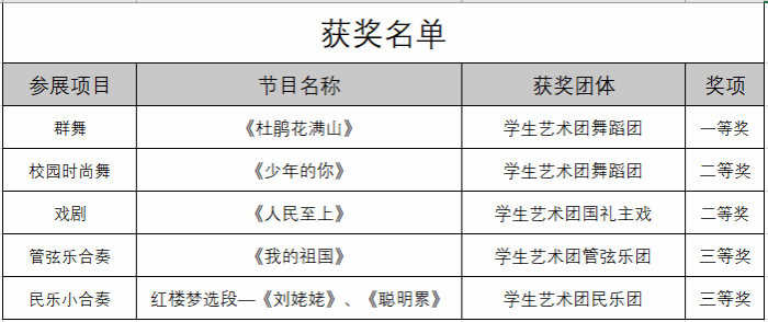 近日,由天津市教委主辦的2020年天津市學(xué)校美育實(shí)踐課堂——天津市學(xué)校文藝展演比賽正式落下了帷幕。金沙城js93線路檢測中心學(xué)生藝術(shù)團(tuán)在本次文藝展演中取得了優(yōu)異成績,共榮獲一等獎(jiǎng)一項(xiàng)、二等獎(jiǎng)兩項(xiàng)、三等獎(jiǎng)兩項(xiàng)。其中,學(xué)生藝術(shù)團(tuán)舞蹈團(tuán)群舞節(jié)目《杜鵑花滿山》榮獲大學(xué)組一等獎(jiǎng);舞蹈團(tuán)校園時(shí)尚舞蹈節(jié)目《少年的你》、國禮主戲戲劇節(jié)目《人民至上》榮獲大學(xué)組二等獎(jiǎng);管弦樂團(tuán)管弦樂合奏《我的祖國》和民樂團(tuán)民樂小合奏《劉姥姥》《聰明累》榮獲大學(xué)組三等獎(jiǎng)。