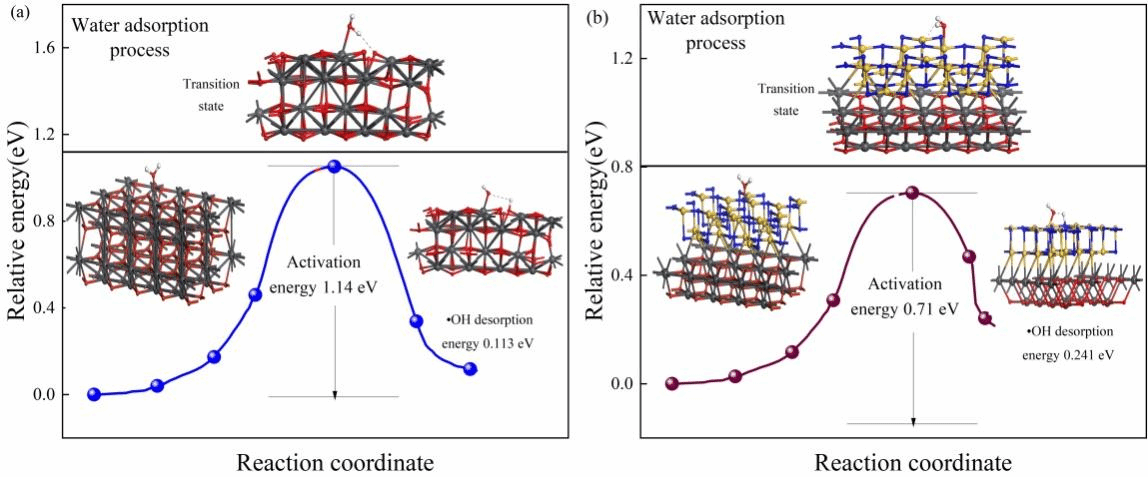 Figure 4 Minimum energy pathway for water adsorption, ·OH generation and desorption process on (a) PbO2 and (b) Si3N4-PbO2 calculate with NEB.