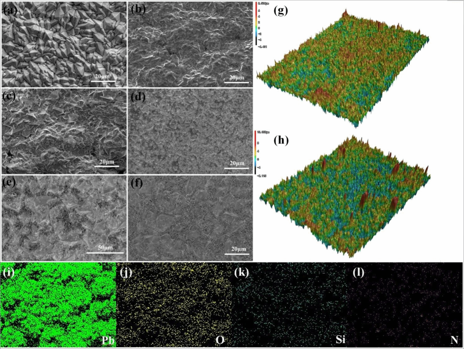 Figure 1 SEM images of (a) PbO2 electrode, (b) Si3N4-PbO2-2 g L-1, (c) Si3N4-PbO2-4 g L-1, (d)Si3N4-PbO2-6 g L-1, (e) Enlarged image of (d), (f) Si3N4-PbO2- 8 g L-1, 3D confocal laser microscope(X2000) of (g) PbO2 electrode (h) Si3N4-PbO2-6 g L-1 electrode, EDS mapping images of (i) Pb, (j) O,(k) Si, (l) N