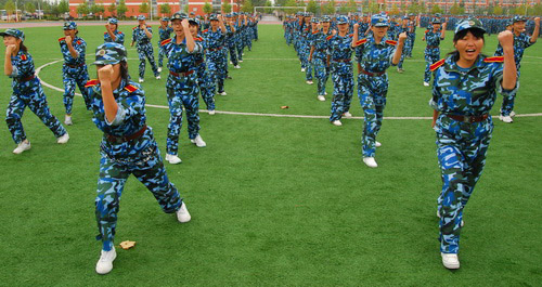 軍訓科目匯報表演:女兵方陣軍體拳表演