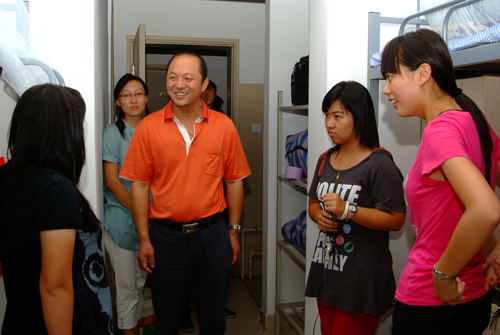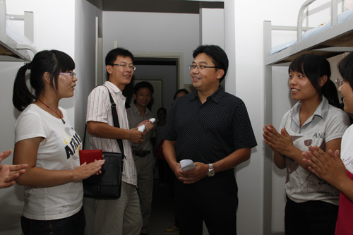 9月4日晚,院長郭景文、黨委書記王斌、副院長曹連東、財務總監肖組剛在相關職能部門負責人的陪同下走訪了新生宿舍,了解他們入學以來的生活、學習情況。