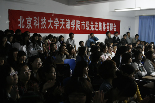本次答辯采用參評班級和個人現場抽簽決定答辯順序的方式。在先進集體答辯中,參評班級派出1-4名代表向評委和觀眾介紹本班情況,最后由評委提問并評分。答辯開始后,各班以幻燈片及視頻展示的方式向觀眾和評委介紹了各自在思想、學習、工作、生活等方面所取得的驕人成績。答辯現場,作為“啦啦隊”的班級其他成員,用條幅、合唱等形式多樣的方式為答辯的同學加油,突出了班級團結向上的良好氛圍。
