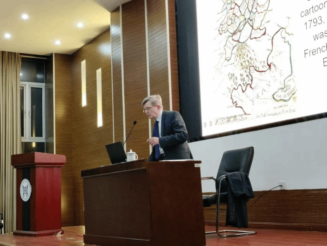 Buck教授從中世紀后期英國民族意識的形成開始講起,梳理了英國十幾個世紀的歷史文化精華。Buck教授生動、詳細的講座,加強了在場師生對英國歷史和文化發展進程的進一步了解:英國在中世紀的時候是基督教歐洲區域的一部分;16世紀的宗教改革將英格蘭從歐洲實體中分離出來,在受到文藝復興影響的同時,英國獨特發展的身份得以塑造,使其與西班牙的征服和反征服的過程中幸存下來;17世紀的宗教沖突導致了英國兩黨制和辯論文化的建立,促進了英國科學、技術以及藝術和思想領域的蓬勃發展,進而使得英國成為了一個在國際領域具有影響的大國,開啟了歐洲工業革命的序幕,而工業革命反過來又推動了英國乃至世界的社會科學發展。由歷史演化到預測當今世界的發展,Buck教授深入探討了20世紀中葉英國大國地位的逐漸喪失和英國社會構成變化的原因,為聽眾展示出英國社會發展進程中的一幀幀畫面。講座的問答互動環節氣氛熱烈,學生踴躍發言提問,積極發表自己的見解并就自己的疑惑向教授請教,Buck教授對提出的問題做了耐心地做了一一解答。
