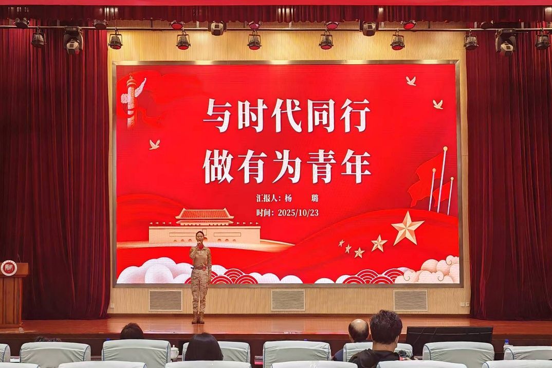 決賽現場,楊璐同學首先回顧了青年時期的李大釗、周恩來和魯迅,是他們扛起了民族救亡的重擔。并回顧了自己的曾祖父,參加抗美援朝戰爭在身體上留下層層傷疤,親身感受到這一代人以血肉之軀筑起中華民族的鋼鐵長城。第二部分結合自身實際,回顧了自己五年的軍旅生活,不僅鍛煉了她強健的體魄,更讓她讀懂了理想與信仰、堅持與責任。現在身為大學生的她,還有另一個身份——民兵。9月3日,作為民兵方隊一員走過天安門廣場,接受檢閱。她說:“當和那些‘最可愛的人’在一起,自豪感與使命感總會油然而生”。相信在未來前進的道路上,她一定會不忘初心,用實際行動書寫零零后的責任與擔當。最后,楊璐同學呼吁新時代的有為青年無需人人驚天動地,但必有赤誠初心。接過先輩的火炬,與時代同行,做有為青年,在祖國需要的地方綻放最美的青春之花!
