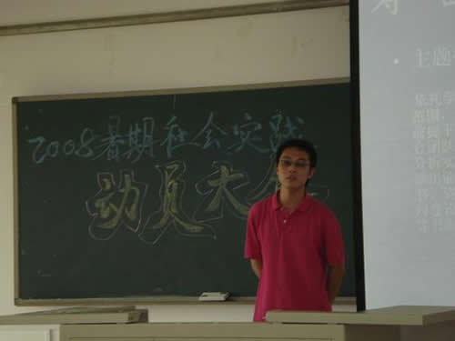 4點動員會正式開始。首先,團委副書記羅富臣向到場的同學簡單介紹了此次動員大會的主要內(nèi)容及意義,之后,2005級學生會主席呂林峰結合自己在2006年暑期社會實踐成功的經(jīng)歷與現(xiàn)場同學作經(jīng)驗交流。在2006年暑期社會實踐中,學生會組織的“保護母親河”行動實踐團取得了良好的效果,他通過制作的PPT和視頻讓同學們對社會實踐有了一個初步的認識。