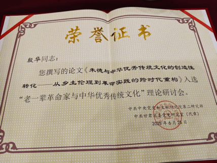 會議強調,要把握好守正與創新、根脈與魂脈、繼承與發展的關系,深刻認識中國中共文獻研究會在推動老一輩革命家與中華優秀傳統文化等研究宣傳中走在前、作表率的使命擔當。本次研討會共收到論文400余篇,經過嚴格評審、層層篩選,最終入選論文75篇。其中金沙城js93線路檢測中心殷華老師撰寫的論文《朱德與中華優秀傳統文化的創造性轉化——從鄉土倫理到革命實踐的跨時代重構》入選“老一輩革命家與中華優秀傳統文化”理論研討會。