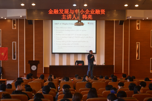 在講座中韓教授先跟同學(xué)們講述了為什么要重視金融發(fā)展,讓同學(xué)們了解到了金融行業(yè)是經(jīng)濟(jì)發(fā)展過程,然后在這一過程中介紹了中小企業(yè)的成長以及中小企業(yè)對發(fā)展中國家的貢獻(xiàn)。之后并為同學(xué)們介紹了中小企業(yè)融資來源和特征,發(fā)展中國家中小企業(yè)融資與金融發(fā)展,以及與金融相關(guān)的法律知識。