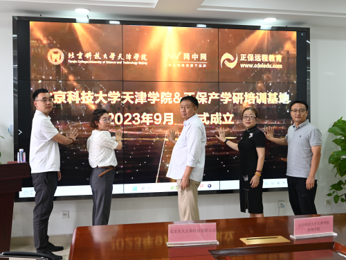 2023年9月6日上午,北京科技大學天津學院管理學院與北京東大正??萍加邢薰驹?2-300會議室正式進行了“正保產學研培訓基地”簽約及授牌儀式。正保遠程教育國際事業部天津區經理佟運強,廈門網中網有限公司區域經理梁萌,廈門網中網軟件有限公司研發中心實施經理王海全蒞臨我校。北京科技大學天津學院院長助理、學術委員會主席宋存義老師,管理學院常務副院長王賓容老師、管理學院黨總支書記李光老師,管理學院副院長王曉欣老師及教師代表出席簽約儀式。