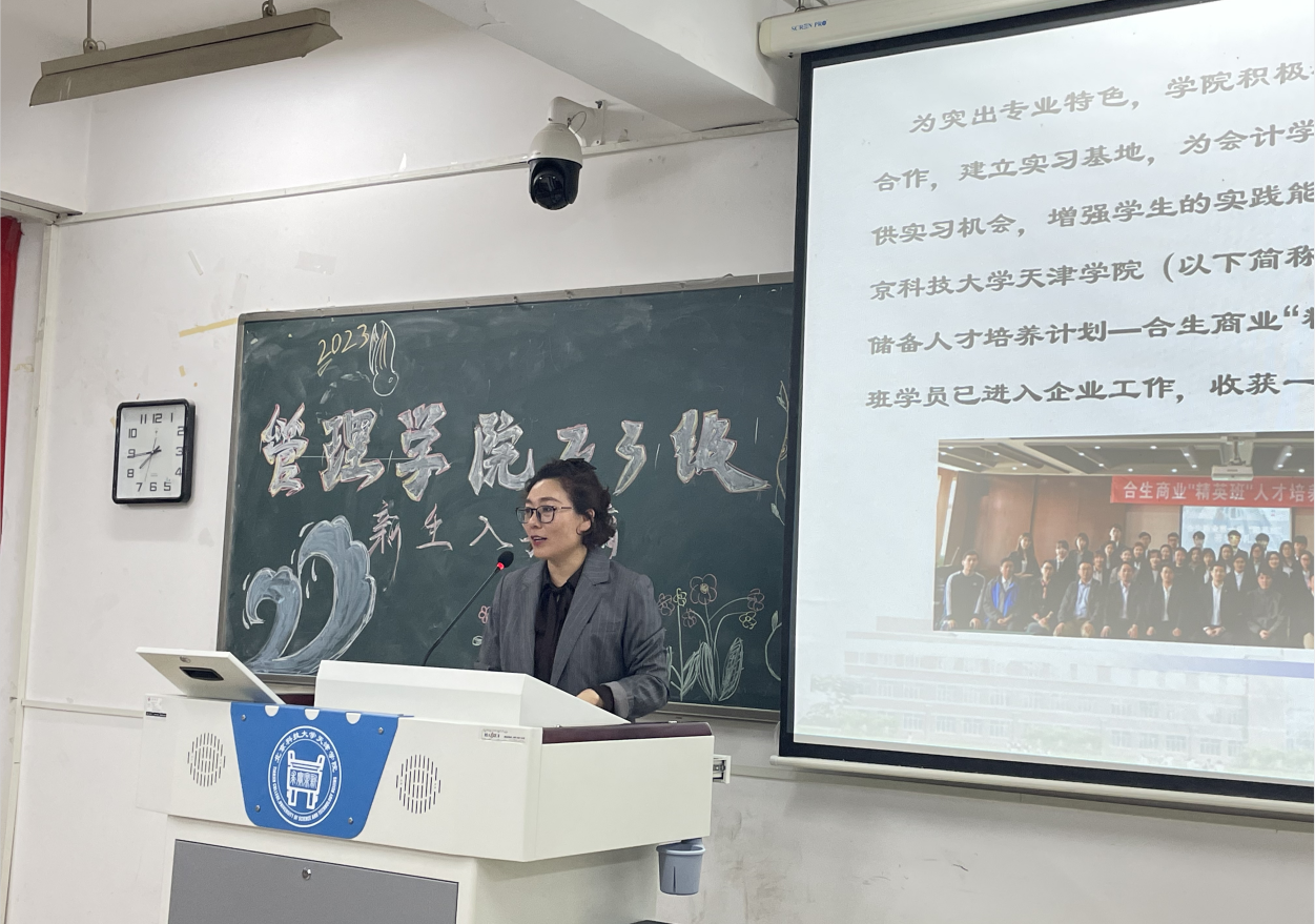管理學院副院長王曉欣老師向大家介紹了管理學院的17位專職教師,向2023級同學們詳細介紹了各位老師所帶的專業課程以及實驗建設情況。