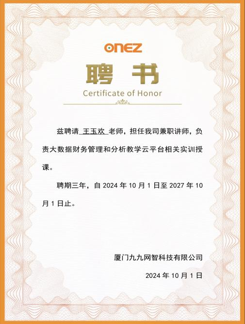 在培訓過程中,管理學院十分注重對青年教師的培養(yǎng),著力為青年教師深度拓展各種培訓平臺,不斷給予系統(tǒng)培訓機會,幫助青年教師專業(yè)成長,教師們在培訓期間也收獲頗豐。今年暑假管理學院任潔老師和王玉歡老師依托財務報表一流課程建設,參加了廈門九九網(wǎng)智科技有限公司組織的大數(shù)據(jù)財務管理和分析教學云平臺相關實訓,并通過考核,獲得培訓證書。隨著數(shù)字化技術和智能化技術的快速發(fā)展,相關技術已經(jīng)廣泛運用于會計信息處理、財務報告編制、審計和稅務等方面,此次培訓結合大數(shù)據(jù)分析技術,對大規(guī)模財務數(shù)據(jù)進行數(shù)據(jù)清洗、轉換和詳細分析,最終實現(xiàn)數(shù)據(jù)可視化功能,能夠滿足金沙城js93線路檢測中心專業(yè)課程和教師技能發(fā)展需求,良好提升教師數(shù)字化技能。由于金沙城js93線路檢測中心王玉歡老師在此培訓中表現(xiàn)突出,并在最終考核時取得優(yōu)異成績,九九網(wǎng)智科技有限公司特地向該教師發(fā)出邀請,擔任兼職講師,最終王玉歡老師獲得兼職講師聘書。
