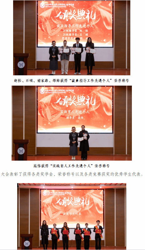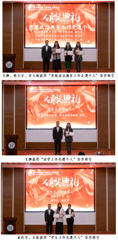 此次表彰大會分別對學院榮獲“教學比賽先進個人”、“學生工作先進個人”等9個類別獎項的教師,以及榮獲各類獎學金和榮譽稱號的學生代表和集體進行了表彰。
