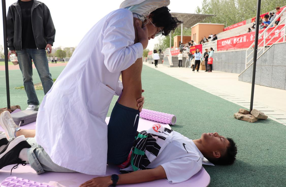 4月19日,師生代表們?cè)趯W(xué)院西操場開展志愿服務(wù)活動(dòng)。在校運(yùn)會(huì)比賽的各個(gè)階段,康復(fù)治療系的師生志愿者們都積極的為參賽者進(jìn)行拉伸指導(dǎo)和肌肉放松,確保每位運(yùn)動(dòng)員都能在安全和舒適的環(huán)境中恢復(fù)體力。康復(fù)治療系的師生們不僅提供了專業(yè)的拉伸服務(wù),還借此機(jī)會(huì)向?qū)W院師生普及健康運(yùn)動(dòng)和科學(xué)恢復(fù)的重要性。他們通過現(xiàn)場演示和講解,讓更多人了解正確的拉伸方法和運(yùn)動(dòng)后的恢復(fù)技巧,從而提高師生的健康意識(shí)和生活質(zhì)量。他們的專業(yè)知識(shí)和熱情服務(wù)得到了師生們的一致好評(píng)。