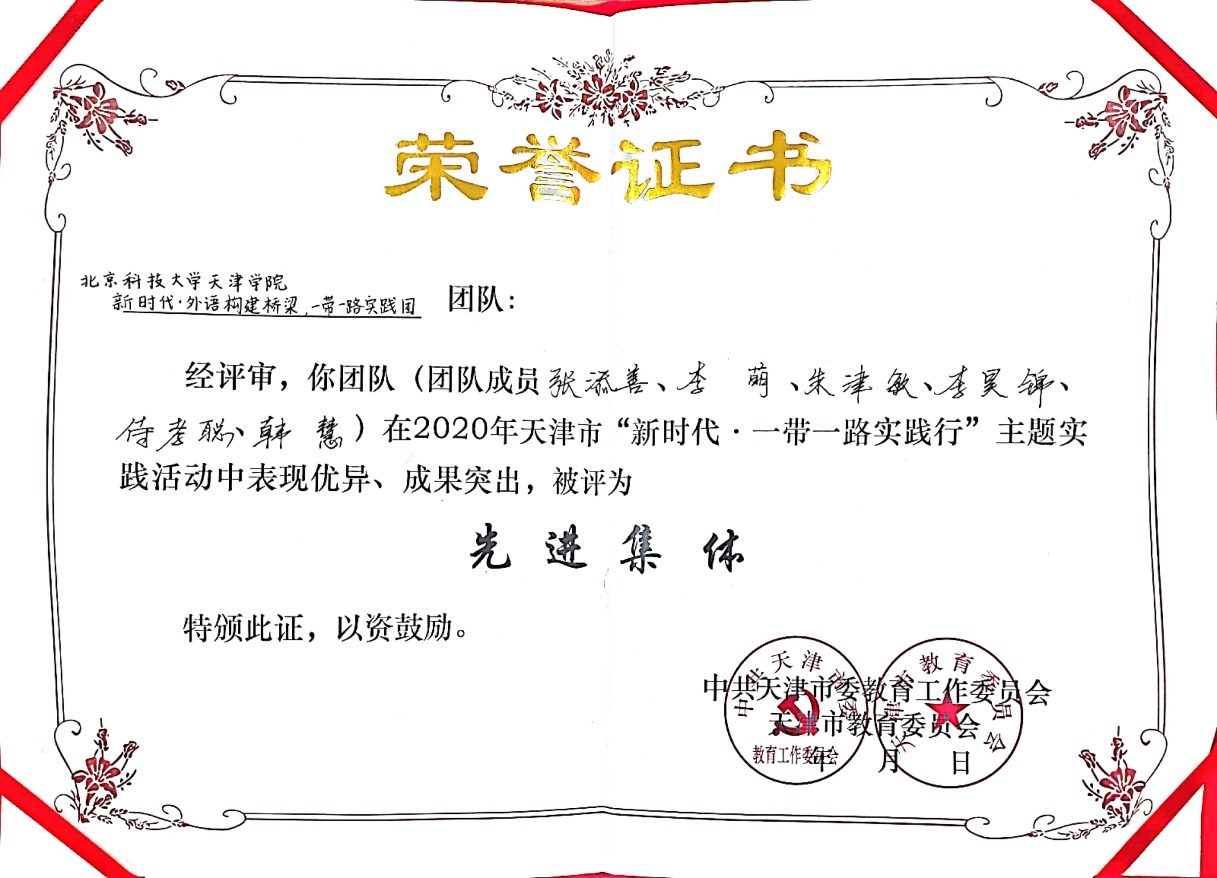 為深入學(xué)習(xí)貫徹習(xí)近平新時代中國特色社會主義思想,引導(dǎo)青年學(xué)生深刻理解“一帶一路”倡議的重大意義,推進(jìn)社會主義核心價值觀教育,譜寫新時代一帶一路新篇章,外國語學(xué)院開展實踐行活動。金沙城js93線路檢測中心“新時代?外語構(gòu)建橋梁,一帶一路”實踐團(tuán)在2020天津市“新時代?一帶一路”實踐行主題活動中榮獲“先進(jìn)集體”稱號;外國語學(xué)院學(xué)生朱津敏表現(xiàn)突出榮獲天津市“先進(jìn)個人”稱號,韓慧、李昊錦、侍孝聰、李紅、何羽婷、秦嘉、王一如等人榮獲校級“先進(jìn)個人”稱號。