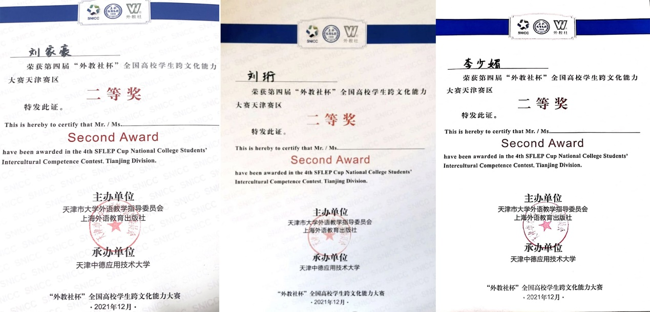 近日,在天津市外語教學指導委員會和上海外語教育出版社主辦的第四屆“外教社杯”全國高校學生跨文化能力大賽天津賽區比賽中,外國語學院三名同學取得佳績,英語專業劉家豪同學、劉珩同學和日語專業李少媚同學榮獲二等獎,指導老師為張媛、姜艷麗、孟彤。