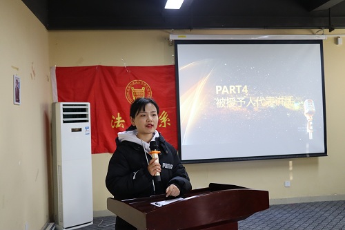 馮海燕老師發(fā)言。她對(duì)通過法考的同學(xué)們表示祝賀,并提出了三點(diǎn)希望:一是希望同學(xué)們以此次頒授儀式為契機(jī),激勵(lì)法律系學(xué)子踏實(shí)學(xué)習(xí),夯實(shí)專業(yè)基礎(chǔ);二是希望同學(xué)們堅(jiān)定信念,樹立自己的學(xué)習(xí)目標(biāo)并為之奮斗。三是希望同學(xué)們能夠?qū)W有所成,為中國(guó)特色社會(huì)主義法治事業(yè)貢獻(xiàn)自己的力量。