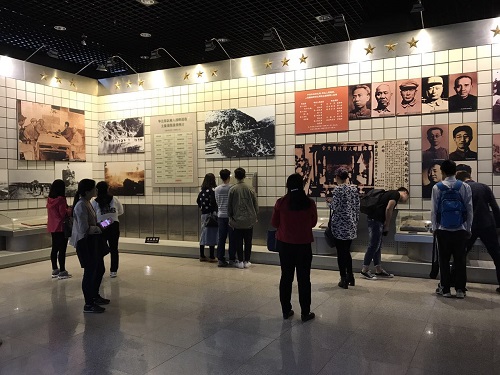 平津戰役的勝利,推動了中國革命的歷史進程,為中華人民共和國的誕生奏出了一部氣勢恢宏的交響曲。在了解了紀念館的總體情況后,大家開始了此次參觀學習之旅。走進館內,首先看到的是毛澤東、劉少奇、朱德、周恩來和任弼時五位偉大革命領袖們高大的銅像。學生黨員們瞻仰了五位偉人的雕塑,并在鮮紅的黨旗前重溫入黨誓詞,牢記黨的宗旨。隨后,同學們逐漸參觀了戰役決策廳、戰役實施廳、人民支前廳等展廳。一幅幅生動的照片、一件件珍貴的文物,無不彰顯著共產黨人對理想的不懈追求。通過大量照片、文獻、實物等展品,大家全面了解了平津戰役從發起到勝利結束的光輝歷程。