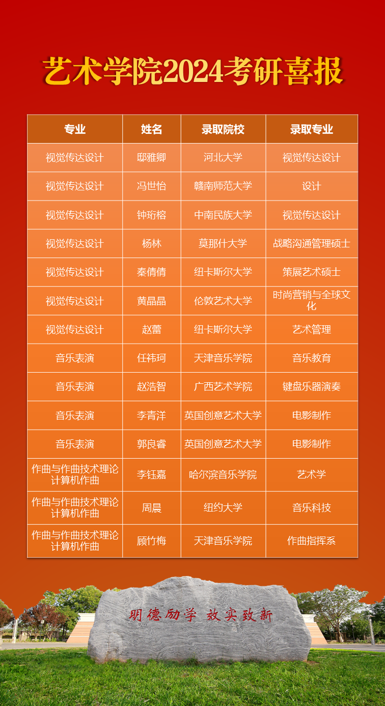 日前,2024年全國碩士研究生招生考試錄取結(jié)果陸續(xù)公布,藝術(shù)學(xué)院考研學(xué)子捷報(bào)頻傳,2024屆畢業(yè)生中,共有14名學(xué)生被順利錄取,其中國內(nèi)高校7所,國外高校7所。 多年以來,藝術(shù)學(xué)院始終將本科生考研作為強(qiáng)化學(xué)風(fēng)建設(shè)...
